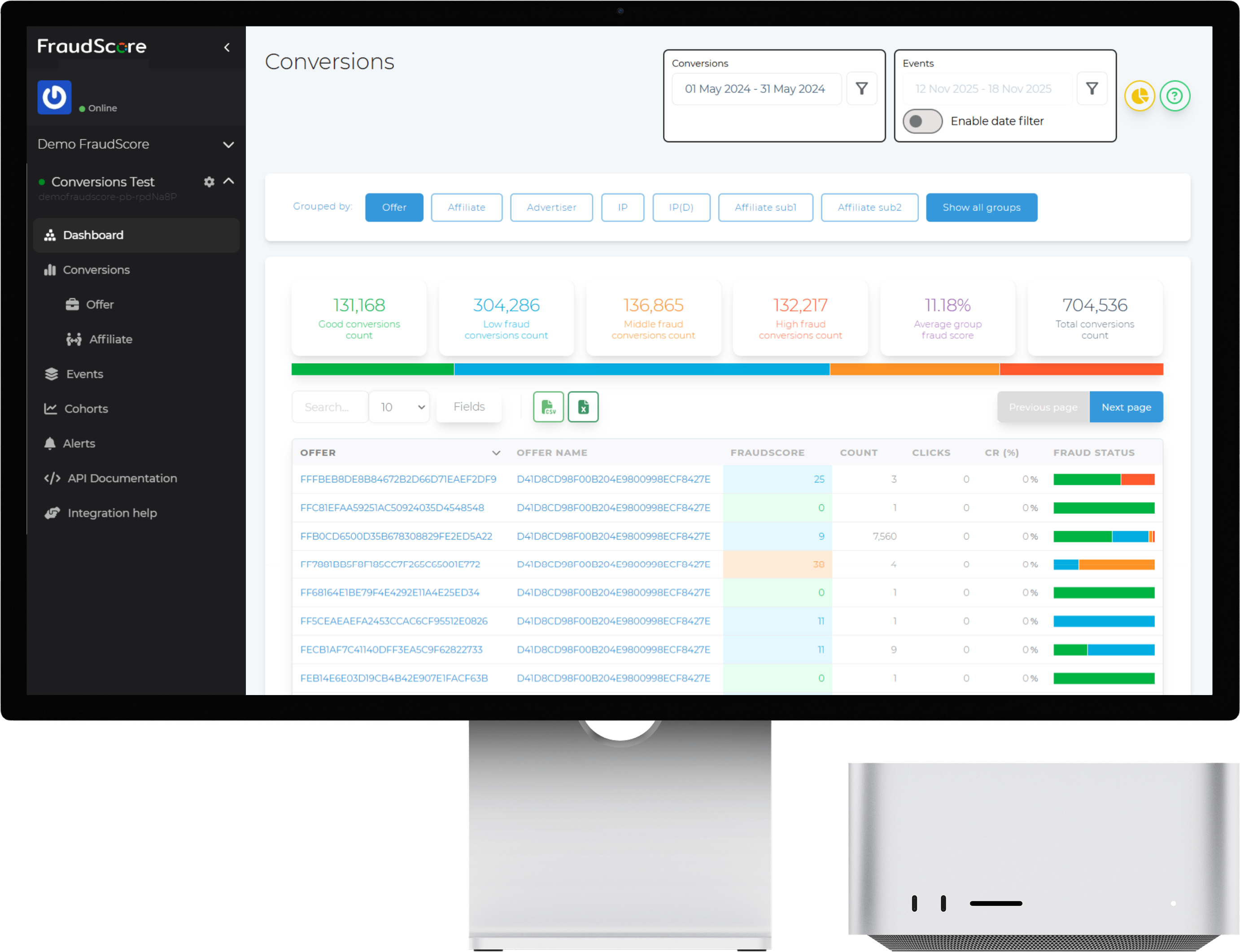 • FraudScore’s fraud monitoring system is particularly useful in this regard as it allows daily check on affiliates conversions and indicates the level of fraud detected for each conversion. The fact that the system not only monitors normal desktop traffic, but, also tracks and accurately reports on mobile traffic in relation to Emulators, VPN’s, Bot farms and IP pattern recognition allows us to make informed decisions when reviewing assigned affiliate caps and encouraging more traffic.