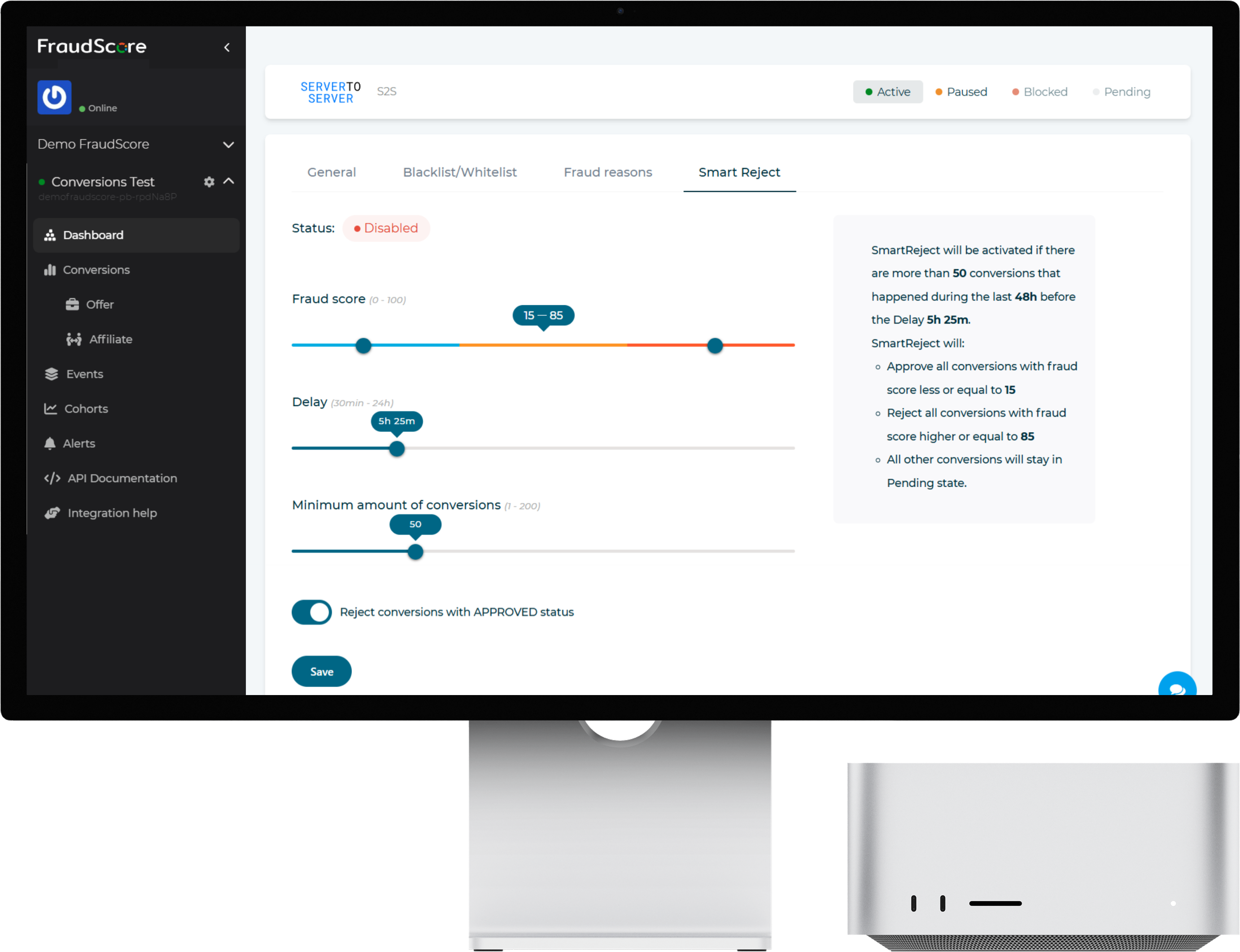 Proactively reject any fraud conversion before your traffic source will see it. This will save your time on fraud reject negotiations.